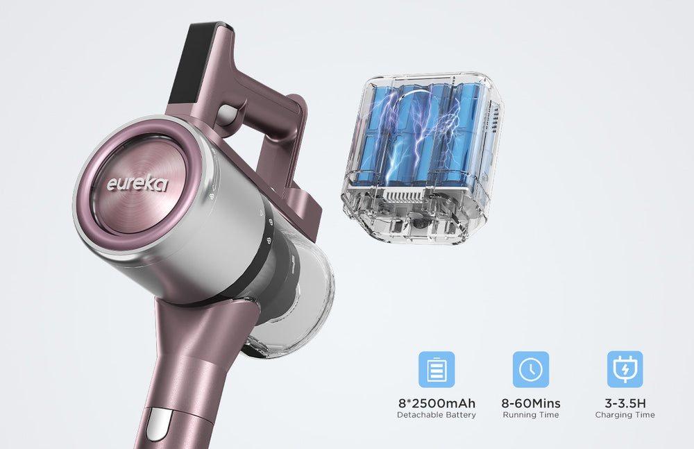 Batteritid på upp till 60 minuter för handdammsugaren i lågt läge, 8*2500mAh batteri med stor kapacitet, lång rengöringstid, djuprengör hela ditt hus enkelt.