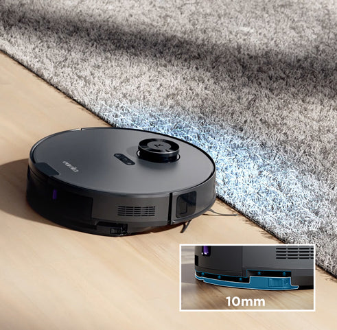 E10s är utrustad med ultraljudsmattdetektering och ett 10 mm moppslag, så att den effektivt upptäcker mattor och förhindrar att de blir blöta. Moppen lyfts automatiskt över trösklar och återgår till laddningsbasen, vilket lämnar dina nymoppade golv fläckfria.